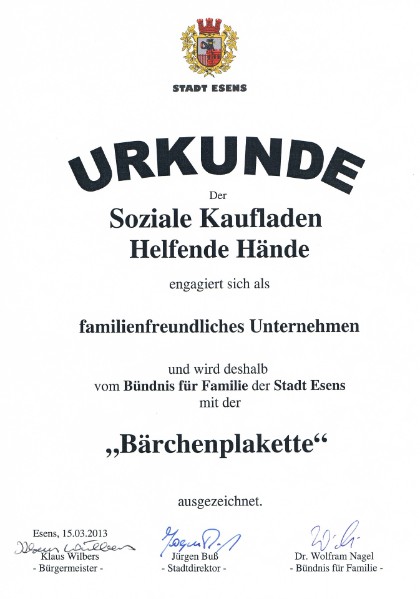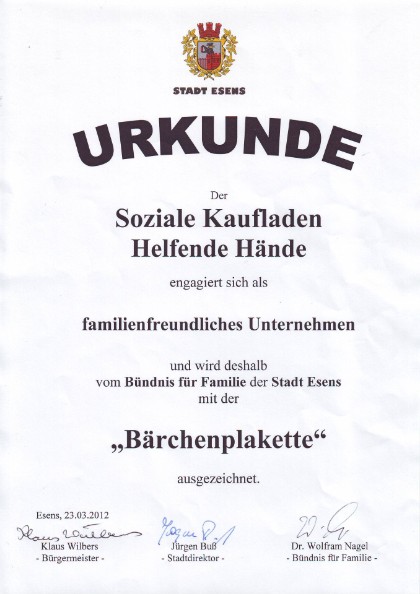Am 23. März 2012 wurden wir auf Grund unseres familienfreundlichen Engagements vom Bündnis für Familie der Stadt Esens - vertreten durch Herrn Bürgermeister Klaus Wilbers, Herrn Stadtdirektor Jürgen Buss und Herrn Dr. Wolfram Nagel, Sprecher des Bündnisses für Familie, mit der Bärchenplakette ausgezeichnet.