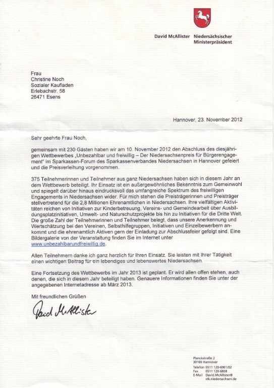 Am 10. November 2012 lud uns der niedersächsische Ministerpräsident David McAllister in das Sparkassen-Forum in Hannover ein, um mit uns und weiteren Teilnehmern den Niedersachsenpreis für Bürgerengagement zu feiern.