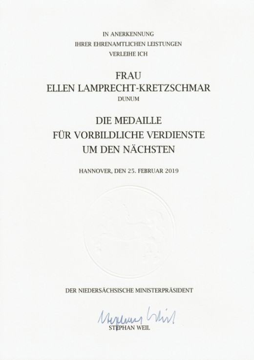 Erhalt der Medaille für vorbildliche Verdienste um den Nächsten