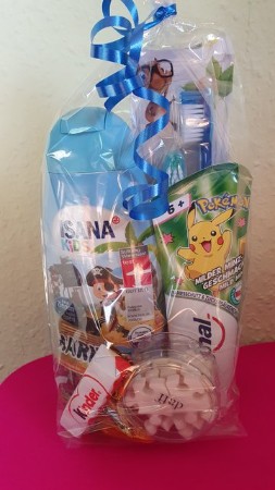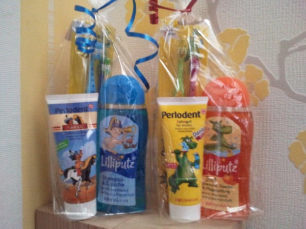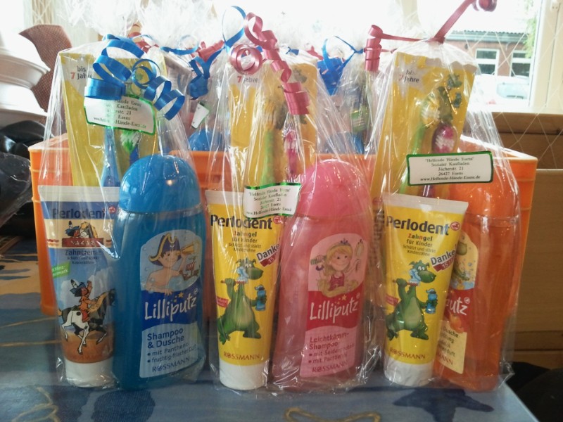 Dieses Mal erhielten alle Kinder und die Daheim gebliebenen Geschwister eine liebevoll gepackte Tüte mit zwei Zahnbürsten, Zahncreme und Duschgel.