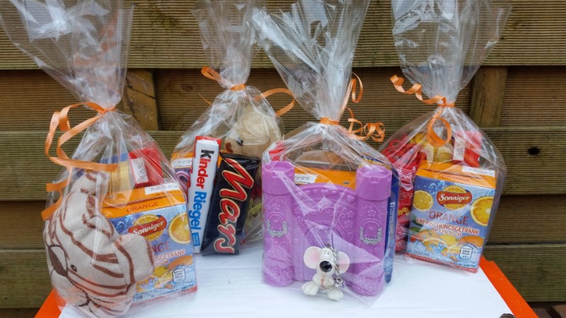Die liebevoll gepackten Tütchen für Kinder enthielten Zahnpasta, Zahnbürsten, Duschgel und Kinderschokolade sowie Gummibärchen und Mini-Herzchen/Mini-Puzzle aus Filz.