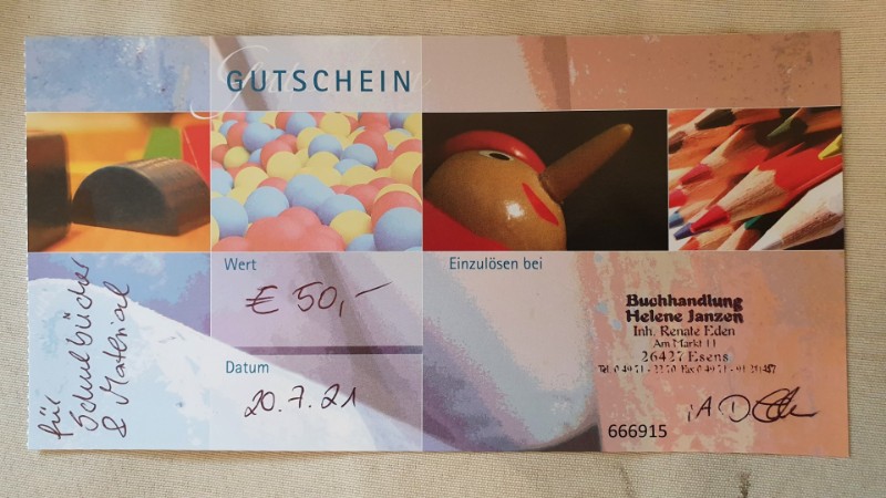 Ein großzügiger Wohltäter hat unserem Laden 10 Gutscheine a 50,00 Euro für Schulbücher