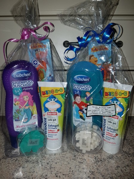Alle Tütchen enthalten kindgerechtes Duschgel sowie Zahnpasta und Zahnbürste im Wert von ca. 5,00 Euro.